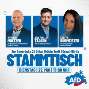 Stammtisch am 27.05.2025 ab 18.00 Uhr in Graal-Müritz Onkel Bräsig Treff Von sburmeister1|2025-06-10T11:22:37+02:0011. Mai 2025|Aktuelles, Pressemeldungen|0 Kommentare Diesen Beitrag verbreiten FacebookXLinkedInPinterestE-Mail Ähnliche Beiträge Bundestagsveranstaltung in Elmenhorst mit Leif-Erik Holm und Enrico Komning am 19.11.2025 ab 18.00 Uhr Gallerie Bundestagsveranstaltung in Elmenhorst mit Leif-Erik Holm und Enrico Komning am 19.11.2025 ab 18.00 Uhr Infostand in Bützow am Freitag, 14.11.2025 von 10.00 – 13.00 Uhr auf dem Marktplatz Gallerie Infostand in Bützow am Freitag, 14.11.2025 von 10.00 – 13.00 Uhr auf dem Marktplatz AfD nominiert Bürgermeisterkandidaten für Sanitz – Mirko Schulze tritt an! Gallerie AfD nominiert Bürgermeisterkandidaten für Sanitz – Mirko Schulze tritt an! Stammtisch in Sanitz am 12.11.2025 ab 18.00 Uhr im Cafe Steffen, Rostocker Str. 6a Gallerie Stammtisch in Sanitz am 12.11.2025 ab 18.00 Uhr im Cafe Steffen, Rostocker Str. 6a Am 05.11.25 von 14.00 – 17.00 Uhr Infostand in Bad Doberan auf dem Marktplatz Gallerie Am 05.11.25 von 14.00 – 17.00 Uhr Infostand in Bad Doberan auf dem Marktplatz Hinterlasse einen Kommentar Antwort abbrechenKommentar Meinen Namen, E-Mail und Website in diesem Browser speichern, bis ich wieder kommentiere.