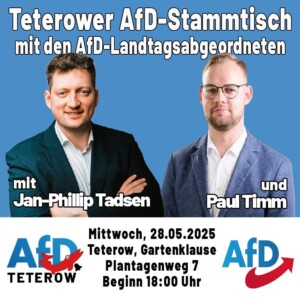 Stammtisch in Teterower Gartenklause mit dem MDL Jan-Phillip Tadsen und Paul Timm am 28.05.25 ab 18.00 Uhr Von sburmeister1|2025-06-10T11:26:55+02:0020. Mai 2025|Aktuelles, Pressemeldungen|0 Kommentare Diesen Beitrag verbreiten FacebookXLinkedInPinterestE-Mail Ähnliche Beiträge Bundestagsveranstaltung in Elmenhorst mit Leif-Erik Holm und Enrico Komning am 19.11.2025 ab 18.00 Uhr Gallerie Bundestagsveranstaltung in Elmenhorst mit Leif-Erik Holm und Enrico Komning am 19.11.2025 ab 18.00 Uhr Infostand in Bützow am Freitag, 14.11.2025 von 10.00 – 13.00 Uhr auf dem Marktplatz Gallerie Infostand in Bützow am Freitag, 14.11.2025 von 10.00 – 13.00 Uhr auf dem Marktplatz AfD nominiert Bürgermeisterkandidaten für Sanitz – Mirko Schulze tritt an! Gallerie AfD nominiert Bürgermeisterkandidaten für Sanitz – Mirko Schulze tritt an! Stammtisch in Sanitz am 12.11.2025 ab 18.00 Uhr im Cafe Steffen, Rostocker Str. 6a Gallerie Stammtisch in Sanitz am 12.11.2025 ab 18.00 Uhr im Cafe Steffen, Rostocker Str. 6a Am 05.11.25 von 14.00 – 17.00 Uhr Infostand in Bad Doberan auf dem Marktplatz Gallerie Am 05.11.25 von 14.00 – 17.00 Uhr Infostand in Bad Doberan auf dem Marktplatz Hinterlasse einen Kommentar Antwort abbrechenKommentar Meinen Namen, E-Mail und Website in diesem Browser speichern, bis ich wieder kommentiere.