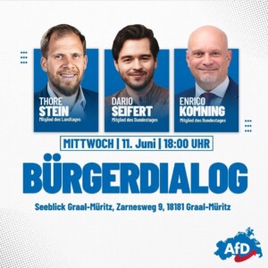 Bürgerdialog in Graal-Müritz am 11.06.2025 ab 18.00 Uhr mit unseren Abgeordneten aus Bundes- und Landtag Von sburmeister1|2025-06-10T11:16:40+02:006. Juni 2025|Aktuelles, Pressemeldungen|0 Kommentare Diesen Beitrag verbreiten FacebookXLinkedInPinterestE-Mail Ähnliche Beiträge Bundestagsveranstaltung in Elmenhorst mit Leif-Erik Holm und Enrico Komning am 19.11.2025 ab 18.00 Uhr Gallerie Bundestagsveranstaltung in Elmenhorst mit Leif-Erik Holm und Enrico Komning am 19.11.2025 ab 18.00 Uhr Infostand in Bützow am Freitag, 14.11.2025 von 10.00 – 13.00 Uhr auf dem Marktplatz Gallerie Infostand in Bützow am Freitag, 14.11.2025 von 10.00 – 13.00 Uhr auf dem Marktplatz AfD nominiert Bürgermeisterkandidaten für Sanitz – Mirko Schulze tritt an! Gallerie AfD nominiert Bürgermeisterkandidaten für Sanitz – Mirko Schulze tritt an! Stammtisch in Sanitz am 12.11.2025 ab 18.00 Uhr im Cafe Steffen, Rostocker Str. 6a Gallerie Stammtisch in Sanitz am 12.11.2025 ab 18.00 Uhr im Cafe Steffen, Rostocker Str. 6a Am 05.11.25 von 14.00 – 17.00 Uhr Infostand in Bad Doberan auf dem Marktplatz Gallerie Am 05.11.25 von 14.00 – 17.00 Uhr Infostand in Bad Doberan auf dem Marktplatz Hinterlasse einen Kommentar Antwort abbrechenKommentar Meinen Namen, E-Mail und Website in diesem Browser speichern, bis ich wieder kommentiere.