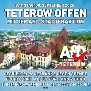 06.09.2025 Teterow offen mit der AfD-Stadtfraktion ab 10.00 Uhr -16.00 Uhr Von sburmeister1|2025-09-02T09:11:30+02:001. September 2025|Aktuelles, Pressemeldungen|0 Kommentare Diesen Beitrag verbreiten FacebookXLinkedInPinterestE-Mail Ähnliche Beiträge Bundestagsveranstaltung in Elmenhorst mit Leif-Erik Holm und Enrico Komning am 19.11.2025 ab 18.00 Uhr Gallerie Bundestagsveranstaltung in Elmenhorst mit Leif-Erik Holm und Enrico Komning am 19.11.2025 ab 18.00 Uhr Infostand in Bützow am Freitag, 14.11.2025 von 10.00 – 13.00 Uhr auf dem Marktplatz Gallerie Infostand in Bützow am Freitag, 14.11.2025 von 10.00 – 13.00 Uhr auf dem Marktplatz AfD nominiert Bürgermeisterkandidaten für Sanitz – Mirko Schulze tritt an! Gallerie AfD nominiert Bürgermeisterkandidaten für Sanitz – Mirko Schulze tritt an! Stammtisch in Sanitz am 12.11.2025 ab 18.00 Uhr im Cafe Steffen, Rostocker Str. 6a Gallerie Stammtisch in Sanitz am 12.11.2025 ab 18.00 Uhr im Cafe Steffen, Rostocker Str. 6a Am 05.11.25 von 14.00 – 17.00 Uhr Infostand in Bad Doberan auf dem Marktplatz Gallerie Am 05.11.25 von 14.00 – 17.00 Uhr Infostand in Bad Doberan auf dem Marktplatz Hinterlasse einen Kommentar Antwort abbrechenKommentar Meinen Namen, E-Mail und Website in diesem Browser speichern, bis ich wieder kommentiere.