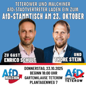 Stammtisch in Teterow am 23.10.2025 ab 18.00 Uhr mit Thore Stein und Enrico Schult Von sburmeister1|2025-10-26T12:29:33+01:0018. Oktober 2025|Aktuelles|0 Kommentare Diesen Beitrag verbreiten FacebookXLinkedInPinterestE-Mail Ähnliche Beiträge Am 05.11.25 von 14.00 – 17.00 Uhr Infostand in Bad Doberan auf dem Marktplatz Gallerie Am 05.11.25 von 14.00 – 17.00 Uhr Infostand in Bad Doberan auf dem Marktplatz Am 27.10.2025 ab 18.00 Uhr – Stammtisch mit MdB Christoph Grimm in Biendorf Gallerie Am 27.10.2025 ab 18.00 Uhr – Stammtisch mit MdB Christoph Grimm in Biendorf Stammtisch in Laage am 20.10.2025 ab 18.00 Uhr im Restaurant Madeleine & Stefan Gallerie Stammtisch in Laage am 20.10.2025 ab 18.00 Uhr im Restaurant Madeleine & Stefan 1. Stammtisch in Schwaan am 16.10.2025 ab 18.00 Uhr im Deutschen Haus – öffentliche Veranstaltung! Gallerie 1. Stammtisch in Schwaan am 16.10.2025 ab 18.00 Uhr im Deutschen Haus – öffentliche Veranstaltung! Infostand in Schwaan am 26.09.2025 von 14.00 – 17.00 Uhr mit Überraschungen! Kommt vorbei Gallerie Infostand in Schwaan am 26.09.2025 von 14.00 – 17.00 Uhr mit Überraschungen! Kommt vorbei Hinterlasse einen Kommentar Antwort abbrechenKommentar Meinen Namen, E-Mail und Website in diesem Browser speichern, bis ich wieder kommentiere.