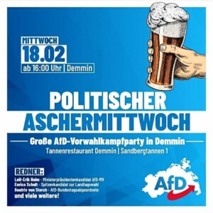 Politischer Aschermittwoch -Großveranstaltung am 18.02.2026 in Demmin ab 16.00 Uhr Von sburmeister1|2026-02-12T15:54:40+01:0011. Februar 2026|Aktuelles, Pressemeldungen, Presseveröffentlichungen|0 Kommentare Diesen Beitrag verbreiten FacebookXLinkedInPinterestE-Mail Ähnliche Beiträge Stammtisch in Güstrow im Akropolis am 17.02.2026 ab 18.00 Uhr Gallerie Stammtisch in Güstrow im Akropolis am 17.02.2026 ab 18.00 Uhr Stammtisch Teterow am 12.02.2026 ab 18.00 Uhr in der Gartenklause Gallerie Stammtisch Teterow am 12.02.2026 ab 18.00 Uhr in der Gartenklause Listenparteitag unserer Alternative für Deutschland in Mecklenburg-Vorpommern Gallerie Listenparteitag unserer Alternative für Deutschland in Mecklenburg-Vorpommern Frauen im politischen Dialog – Kulturhaus Teterow 31.01.2026 ab 18.00 Uhr Gallerie Frauen im politischen Dialog – Kulturhaus Teterow 31.01.2026 ab 18.00 Uhr Frohe Weihnachten! Gallerie Frohe Weihnachten! Hinterlasse einen Kommentar Antwort abbrechenKommentar Meinen Namen, E-Mail und Website in diesem Browser speichern, bis ich wieder kommentiere.