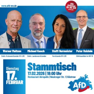 Stammtisch in Güstrow im Akropolis am 17.02.2026 ab 18.00 Uhr Von sburmeister1|2026-02-12T15:47:40+01:0010. Februar 2026|Aktuelles, Pressemeldungen|0 Kommentare Diesen Beitrag verbreiten FacebookXLinkedInPinterestE-Mail Ähnliche Beiträge Stammtisch Teterow am 12.02.2026 ab 18.00 Uhr in der Gartenklause Gallerie Stammtisch Teterow am 12.02.2026 ab 18.00 Uhr in der Gartenklause Frohe Weihnachten! Gallerie Frohe Weihnachten! Bundestagsveranstaltung in Elmenhorst mit Leif-Erik Holm und Enrico Komning am 19.11.2025 ab 18.00 Uhr Gallerie Bundestagsveranstaltung in Elmenhorst mit Leif-Erik Holm und Enrico Komning am 19.11.2025 ab 18.00 Uhr Infostand in Bützow am Freitag, 14.11.2025 von 10.00 – 13.00 Uhr auf dem Marktplatz Gallerie Infostand in Bützow am Freitag, 14.11.2025 von 10.00 – 13.00 Uhr auf dem Marktplatz AfD nominiert Bürgermeisterkandidaten für Sanitz – Mirko Schulze tritt an! Gallerie AfD nominiert Bürgermeisterkandidaten für Sanitz – Mirko Schulze tritt an! Hinterlasse einen Kommentar Antwort abbrechenKommentar Meinen Namen, E-Mail und Website in diesem Browser speichern, bis ich wieder kommentiere.