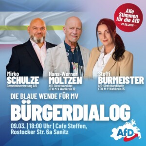 Bürgerdialog in Sanitz am 09.03.2026 ab 18.00 Uhr im „Cafe Steffen“ Von sburmeister1|2026-03-03T13:51:39+01:003. März 2026|Aktuelles, Pressemeldungen, Presseveröffentlichungen|0 Kommentare Diesen Beitrag verbreiten FacebookXLinkedInPinterestE-Mail Ähnliche Beiträge Infostand in Bad Doberan am 19.03.2026 ab 10.00 – 13.00 Uhr am Markt Gallerie Infostand in Bad Doberan am 19.03.2026 ab 10.00 – 13.00 Uhr am Markt Infostand in Sanitz an der Rostocker Straße am 09.03.2026 ab 15.00 – 18.00 Uhr Gallerie Infostand in Sanitz an der Rostocker Straße am 09.03.2026 ab 15.00 – 18.00 Uhr Stammtisch in Hanstorf mit MdL Thore Stein am 27.02.2026 ab 18.00 Uhr – öffentliche Veranstaltung! Gallerie Stammtisch in Hanstorf mit MdL Thore Stein am 27.02.2026 ab 18.00 Uhr – öffentliche Veranstaltung! Stammtisch Graal-Müritz am 24.02.2026 ab 18.00 Uhr Gallerie Stammtisch Graal-Müritz am 24.02.2026 ab 18.00 Uhr Politischer Aschermittwoch -Großveranstaltung am 18.02.2026 in Demmin ab 16.00 Uhr Gallerie Politischer Aschermittwoch -Großveranstaltung am 18.02.2026 in Demmin ab 16.00 Uhr Hinterlasse einen Kommentar Antwort abbrechenKommentar Meinen Namen, E-Mail und Website in diesem Browser speichern, bis ich wieder kommentiere.